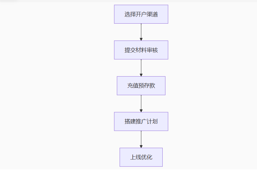 备齐执照/备案 → 选代理或渠道户 → 扫码充值2400+ → 搭计划设关键词 → 开启OCPC投放